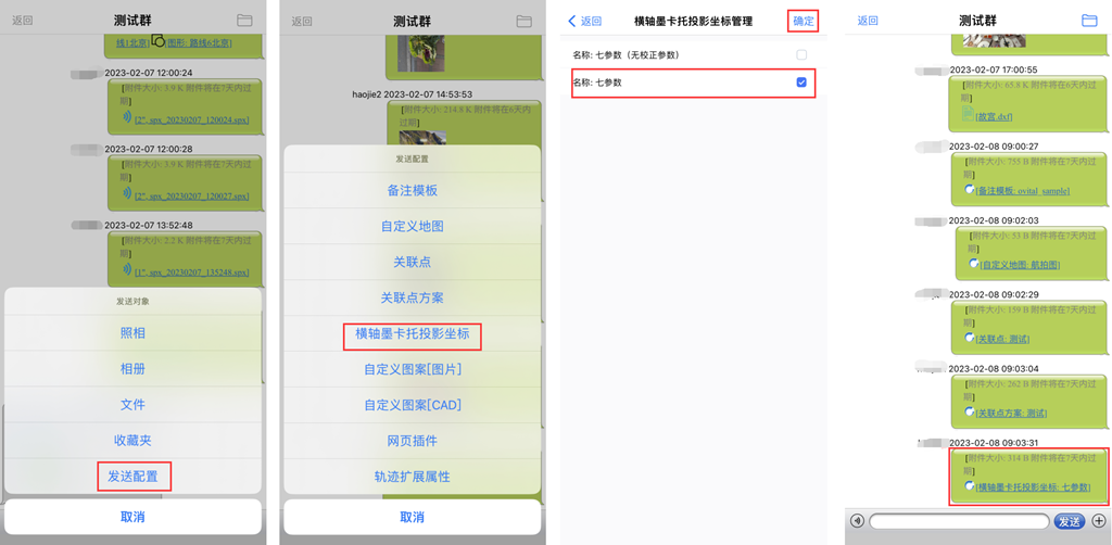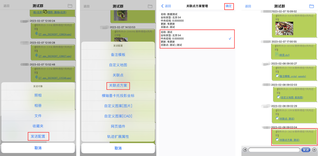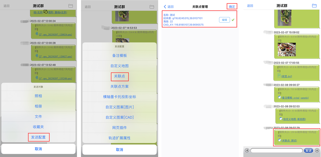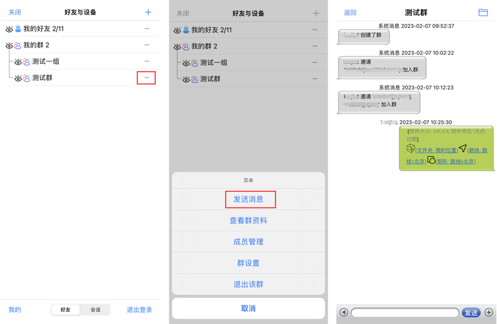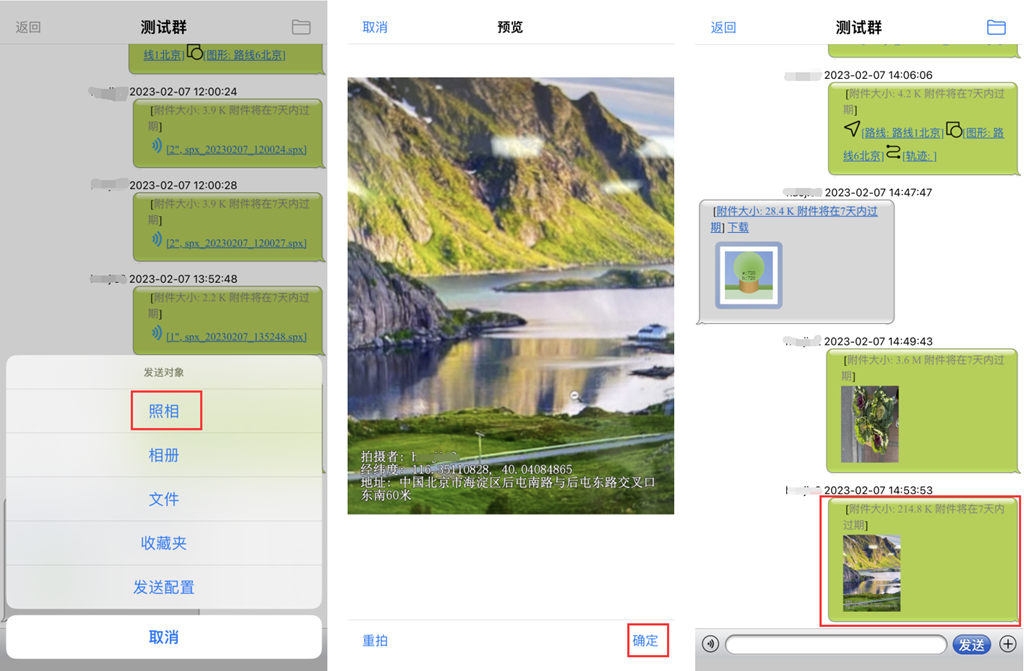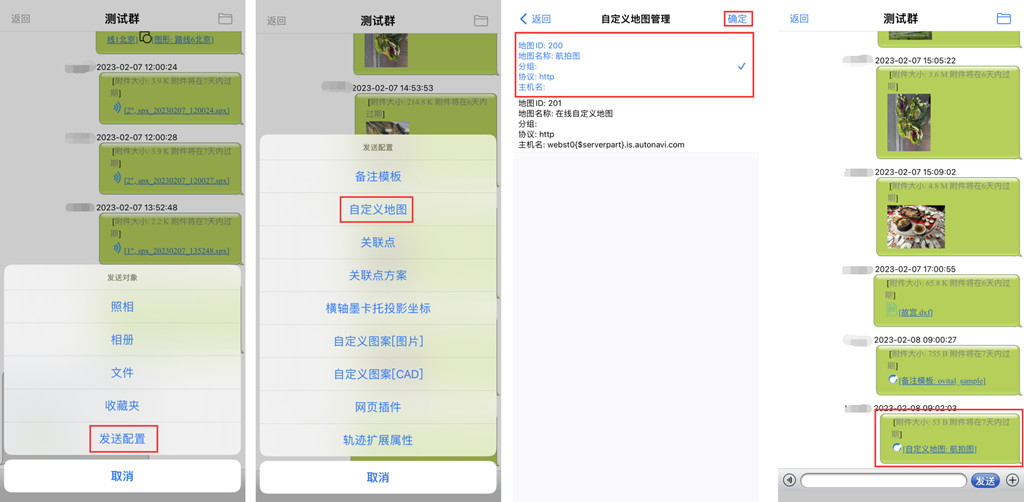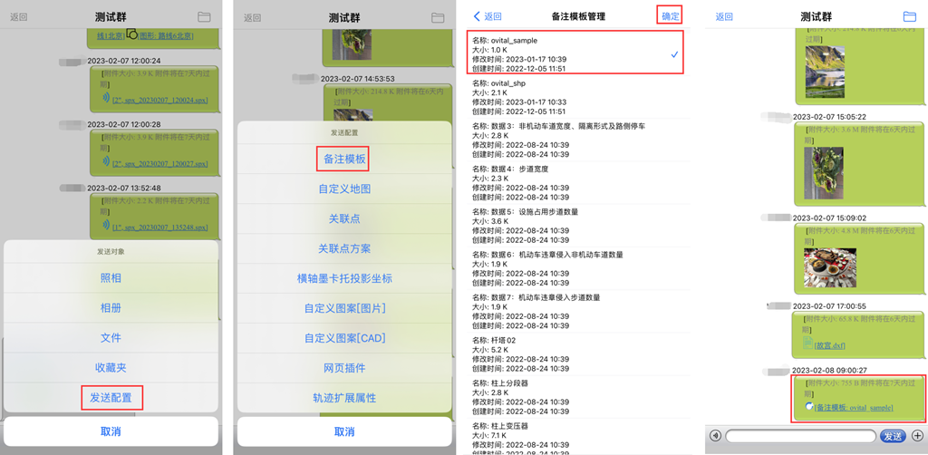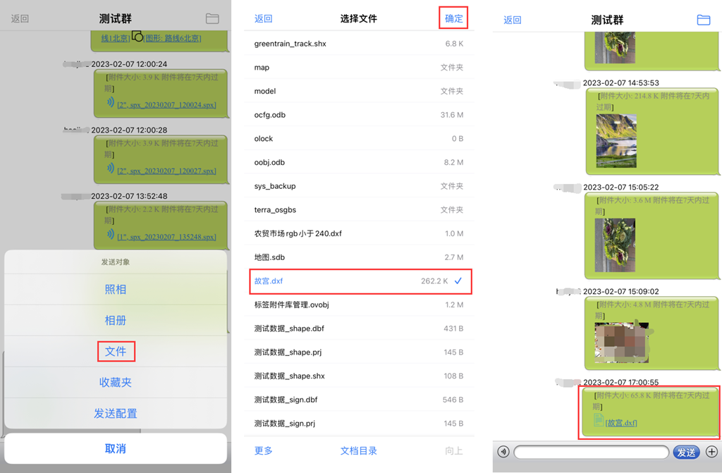 除了可以在群中发送奥维的标签、轨迹、图形、导航路线等数据外,还可以发送手机拍摄的照片以及存储的文件。