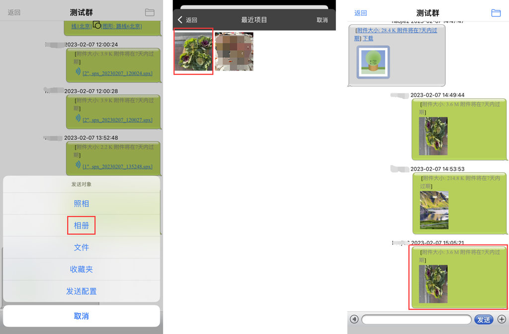 在[发送对象]页面,点击【相册】,选择需要发送的照片,即可发送。