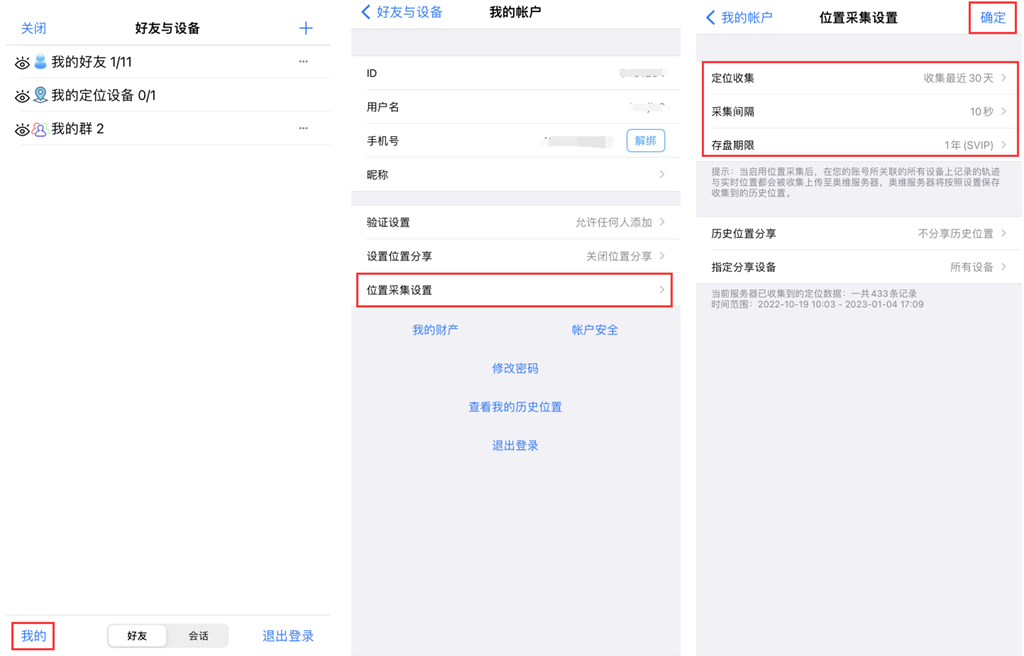 登录账户后,在[好友]页面,点击【设置】,点击【位置采集设置】,设置定位收集、采集间隔、存盘期限等。