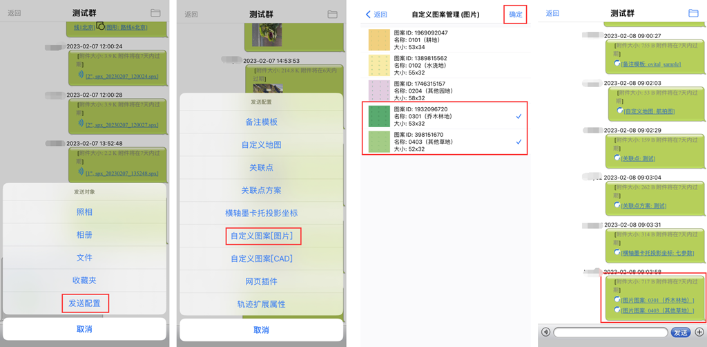 点击[+],在[发送对象]页面,点击[发送配置]→[自定义图案(图片)],系统自动进入自定义图案(图片)管理页面,选择需要发送的自定义图案(图片),点击[选择]即可。