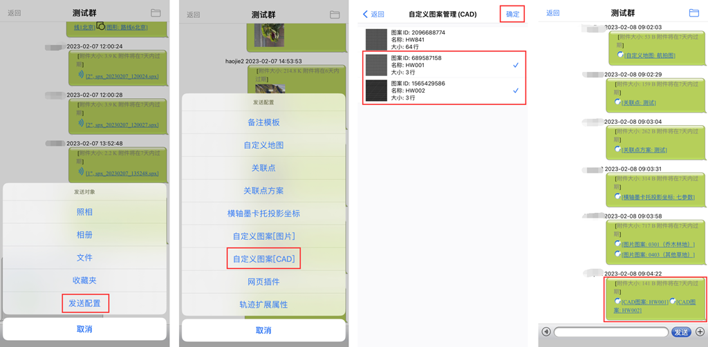 群成员可将设备上的自定义图案(CAD)发送到群中,其他成员可下载使用该自定义图案(CAD)。