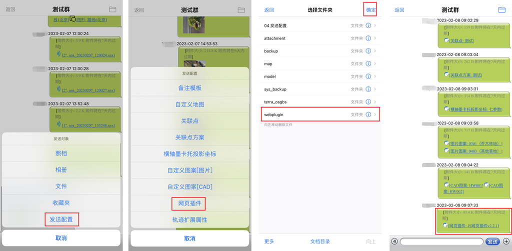 点击[+],在[发送对象]页面,点击[发送配置]→[网页插件],系统自动进入选择文件夹页面,选择需要发送的网页插件文件夹,点击[>],即可。