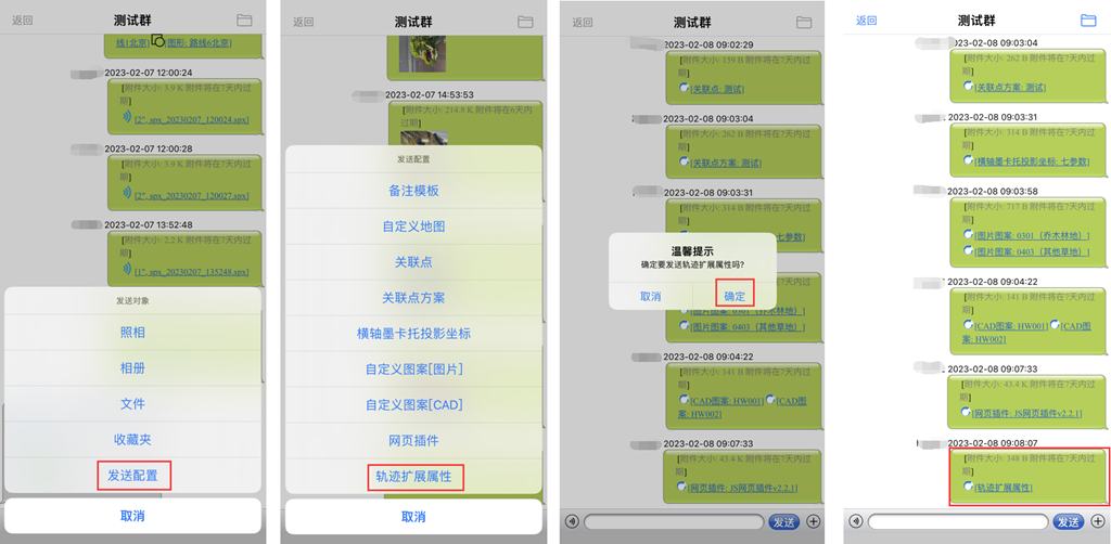 点击[+],在[发送对象]页面,点击[发送配置]→[轨迹扩展属性],系统提示是否确定分享,点击[确定]即可。