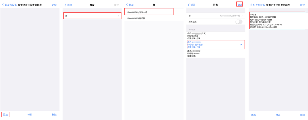 在[查看已关注位置的群友]页面,点击【添加】,点击【群】,选择群,勾选已分享位置的群友A(也可以直接添加所有成员),点击【确定】,即可。