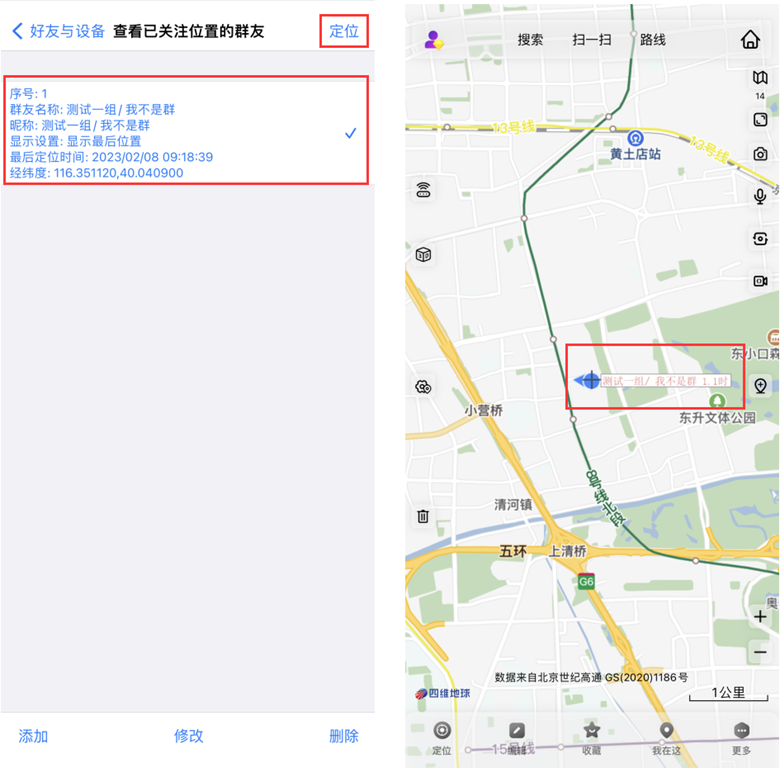 添加后,待群友A产生了定位信息,群友B可在此看到群友A的最后定位时间、经纬度信息,勾选群友A,点击【定位】,即可在地图上定位出群友A的位置。