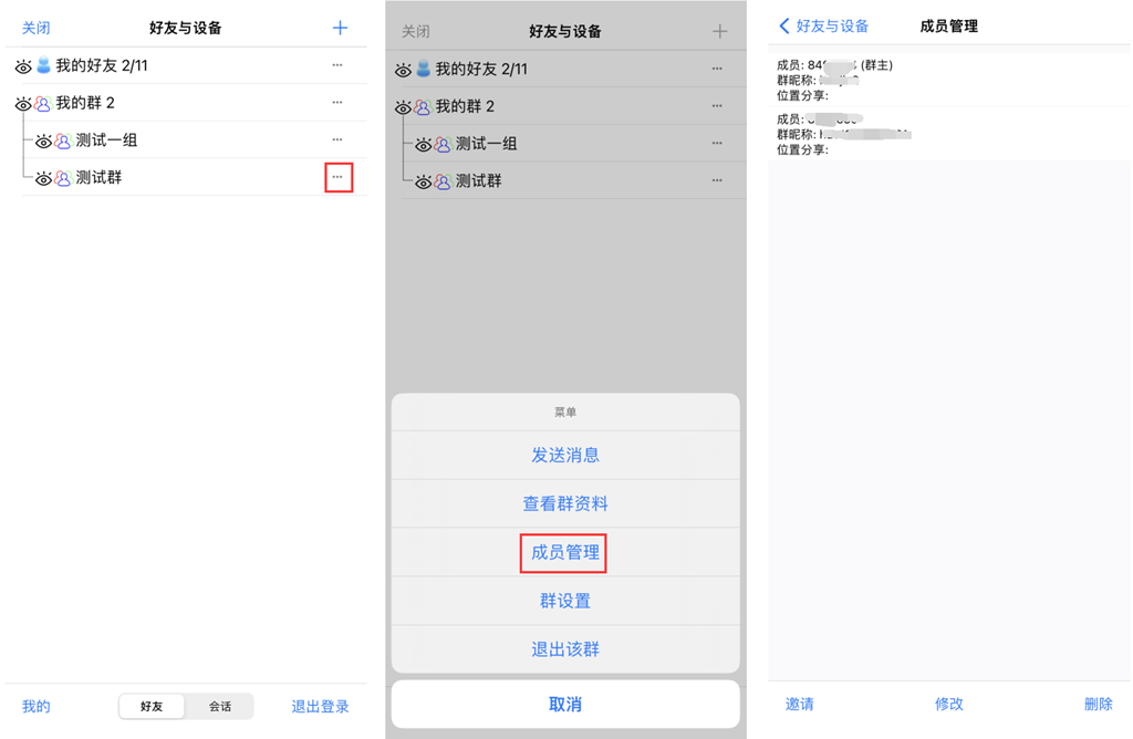 在[我的群]列表下,点击某群右侧的1按钮,弹出[菜单]页面;点击【成员管理】,进入[成员管理]页面,群主可邀请好友加入该群,可修改好友的群昵称。