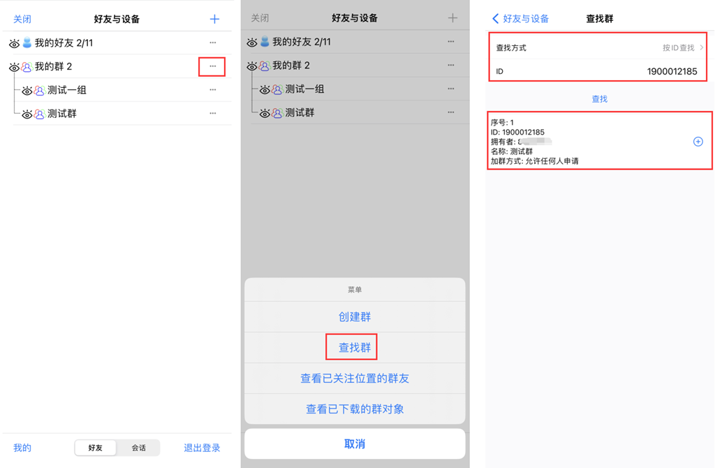 在[好友]页面,点击[我的群]右侧的1按钮,弹出[菜单]页面;点击【查找群】,选择查找方式(包括按ID查找或者按名称查找),输入ID或者名称,点击【查找】按钮,即可。