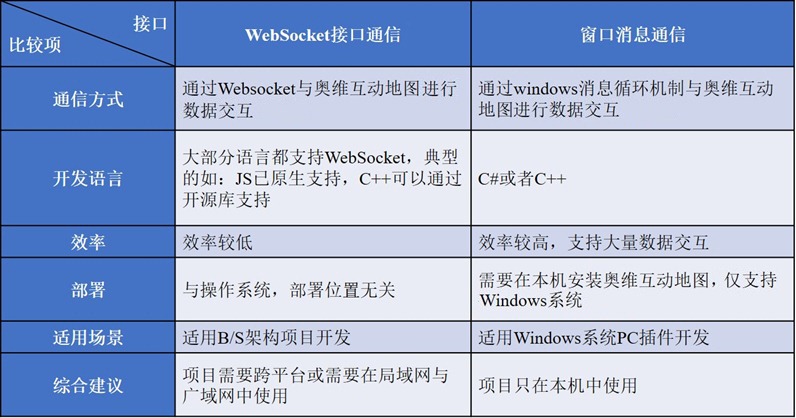 奥维互动地图支持第三方开发接口,允许用户在开发第三方应用的时候,通过奥维提供的开发接口来访问和操作奥维互动地图内部的数据。第三方接口有两种通信方式:WebSocket和Windows窗口消息通信。这两种通信方式各有优缺点,适合不同的场景。