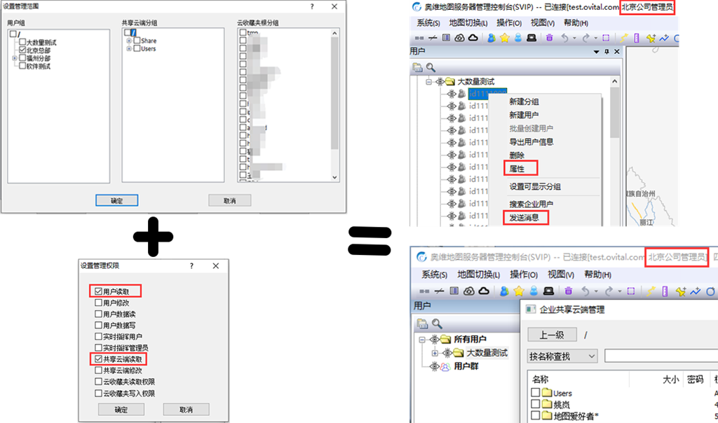 如下图所示,开启用户读取权限后,域管理员可以看到自己权限范围内的用户分组并可见组内用户(非登陆状态的用户是灰度的),并可查看用户"属性",发送即时消息给用户;开启共享云端读取权限后可见并可查看、下载所辖用户共享云端数据。
