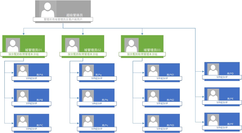 用户读取权限:域管理员可查看管理范围内的用户信息,可见用户并可与用户通信(接收发送消息);