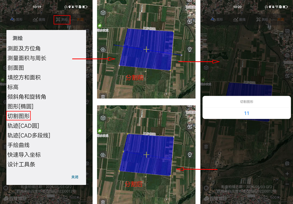 在奥维主界面,点击【编辑】→【测绘】→【切割图形】按钮,绘制一条线段穿过需要切割的图形,点击图片13结束,弹出[切割图形]对话框;点击切割图形名称【11】,图形一分为二。