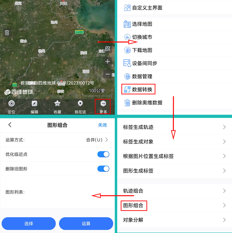 在奥维手机端,点击[更多]→【数据转换】→【图形组合】;运算方式,选择【合并】,点击【选择】。