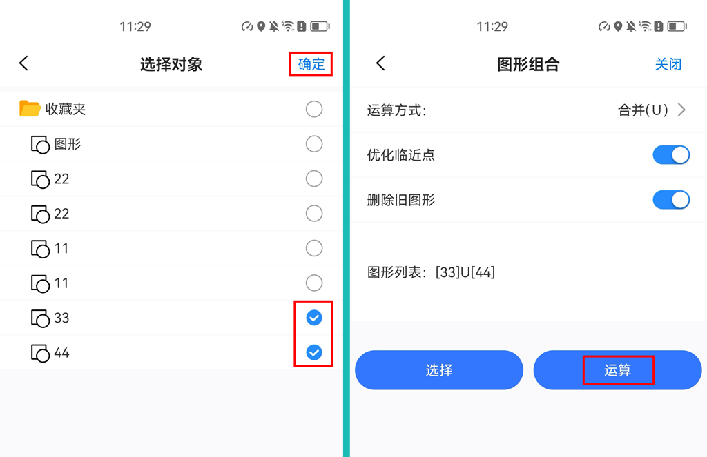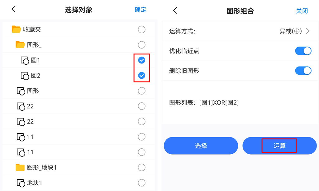勾选需要合并的图形,点击【确定】→【运算】,提示“操作成功”即可。