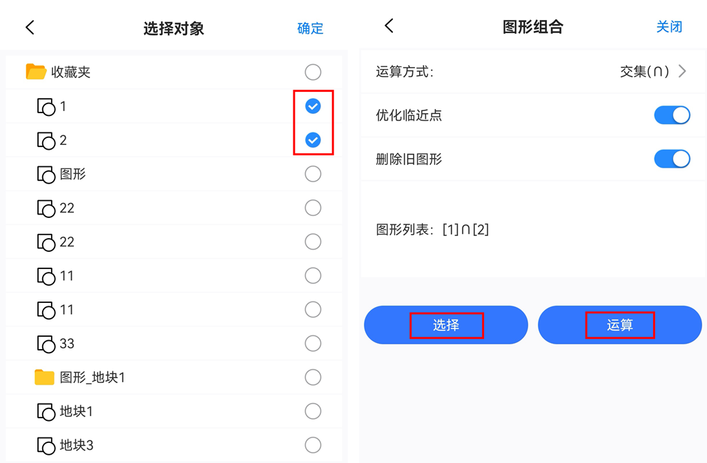 在奥维手机端,点击[更多]→【数据转换】→【图形组合】;运算方式,选择【交集】,点击【选择】。