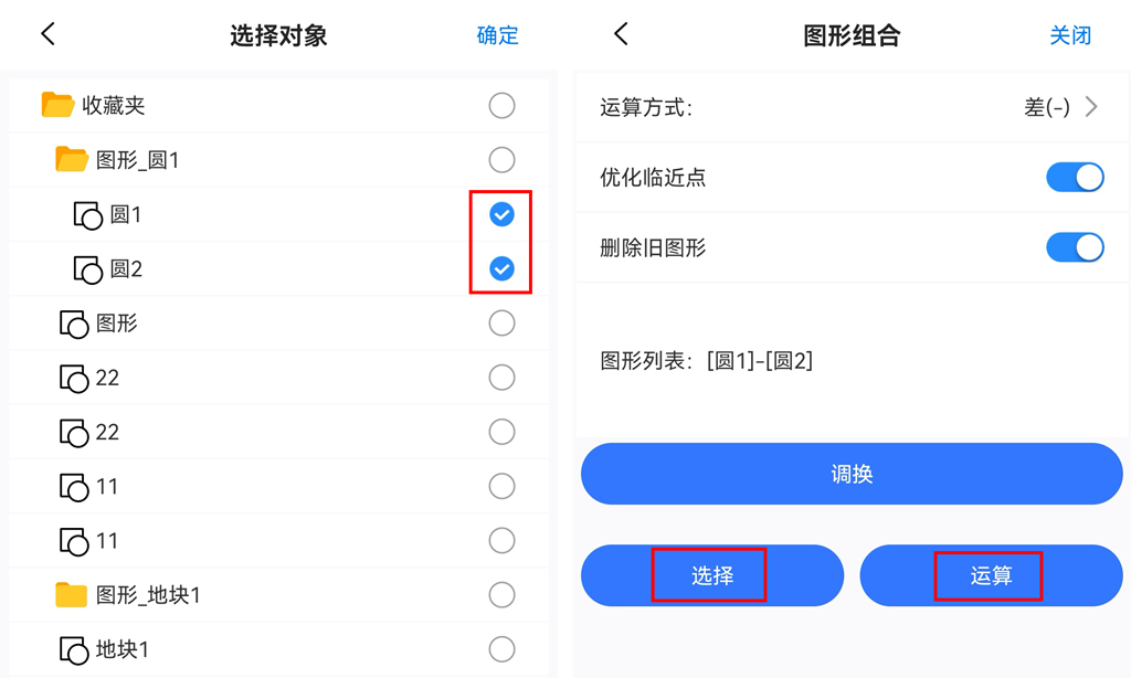 在奥维手机端,点击[更多]→【数据转换】→【图形组合】;运算方式,选择【差】,点击【选择】。