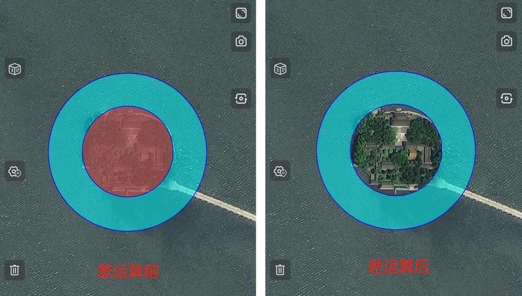 效果1:如下图所示,两个圆作“差”运算(即“大圆减小圆”),小圆被删除,得到“圆环”