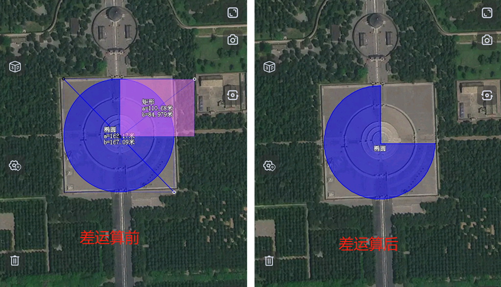 效果2:如下图所示,一个椭圆和一个矩形作“差”运算(即“椭圆减矩形”),矩形被删除(包括两个图形相交的部分)。