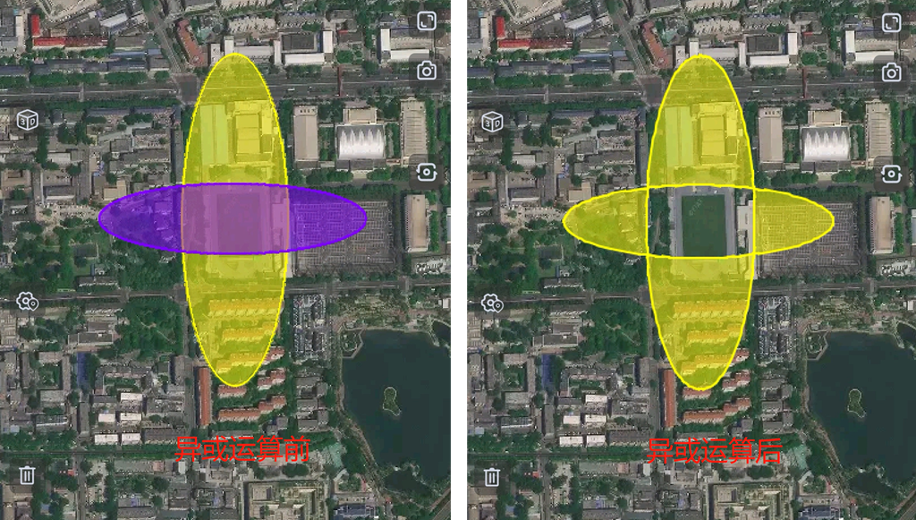 异或运算:将多个图形相交(重叠)部分删除,并组合成一个图形。如果多个不相交的图形作“异或”运算,其效果为图形“合并”。