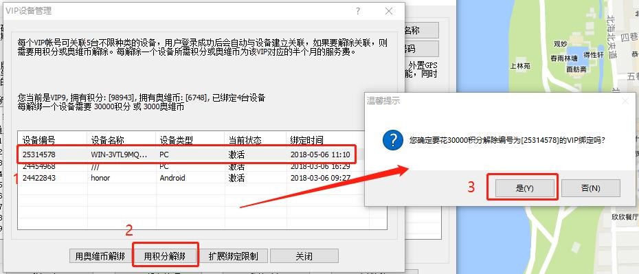 选中需要解除绑定的设备,点击【用积分解绑】按钮,点击【是】按钮,执行解绑。解除绑定后,系统提示“解除绑定成功”。