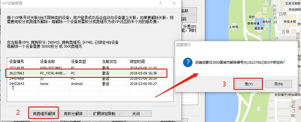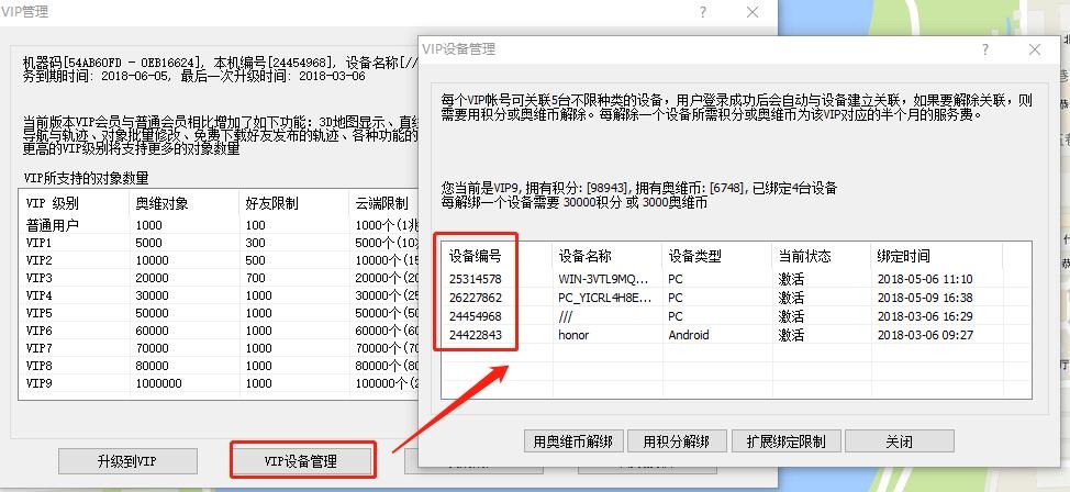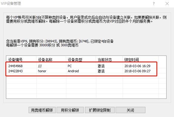 在【VIP管理】窗口中,点击【VIP设备管理】按钮,进入【VIP设备管理】窗口。在【VIP设备管理】窗口中,可查看所有绑定的设备。