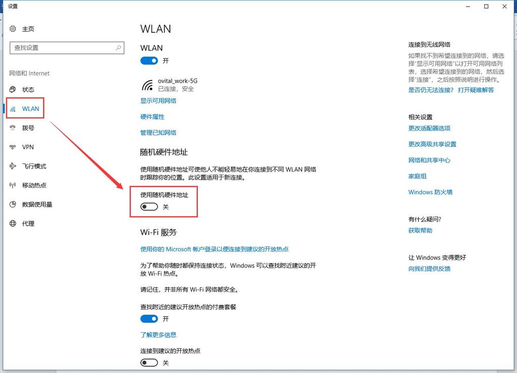 3、在【网络和Internet】页面中,点击【WLAN】,在右侧关闭【使用随机硬件地址】