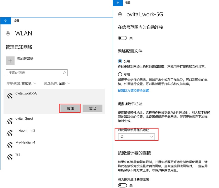 5、在【WLAN】页面中,逐个选择,点击【忘记】,然后再重新连接;不便重新连接的可逐个选择,点击【属性】按钮,进入该设备连接的网络设置页面,在【随机硬件地址】栏中关闭【对此网络使用随机地址】。