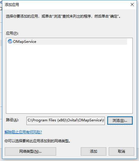4、在下图中点击“浏览”来定位奥维服务器应用程序,默认安装路径是C:\Program Files (x86)\Ovital\OMapService,定位后点击“添加”。