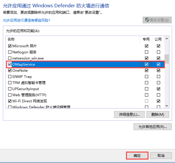 5、添加之后,选中OMapService服务器应用程序,如下图所示将应用的网络选中,然后点击“确定”