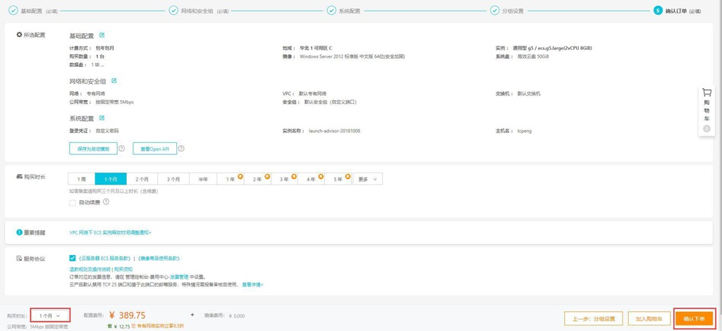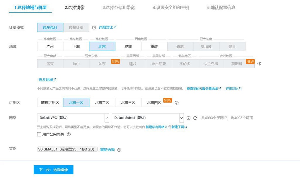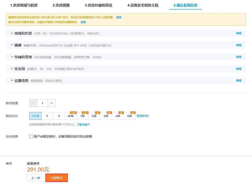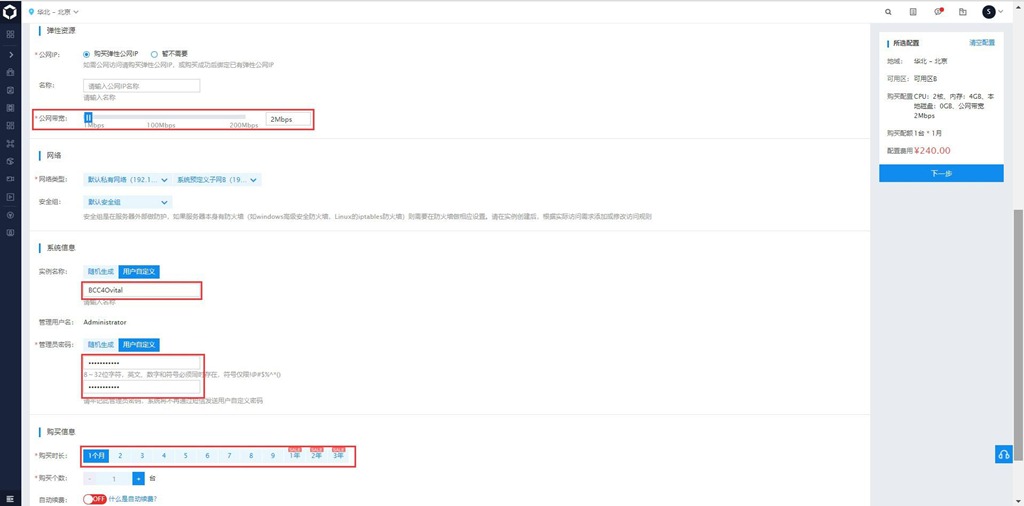 购买信息:选择购买时长和数量。设置完所有信息后,点击【下一步】。