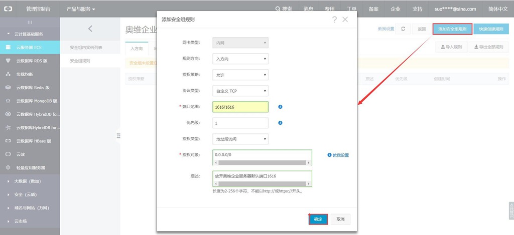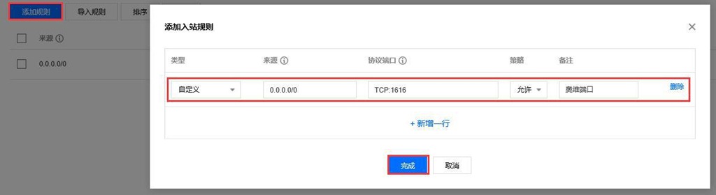 在安全组中需要添加端口规则,这里需要添加的安全组有奥维企业版服务器端口号,默认端口号是1616,如需更改请在上个步骤进行,还需放开Windows或Linux远程登陆此云服务器进行部署的3389端口。