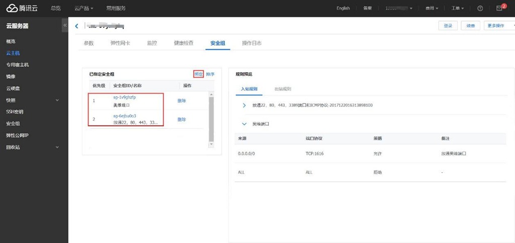 购买完成后,进入[控制台]页面,点击【云服务器】,点击【安全组】,需要添加的安全组有奥维企业版服务器端口号,默认端口号是1616(当然用户也可以根据自己的需要在配置奥维企业服务器时对端口号进行修改)。