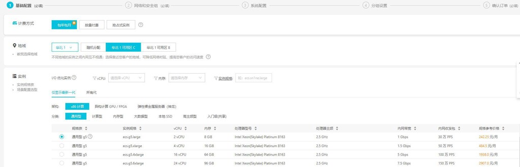 在[自定义购买]页面,进行基本配置。选择计费方式、地域、实例等,如下图所示。