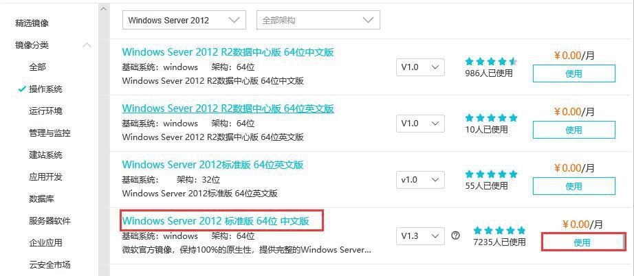 选择镜像,点击镜像市场,点击【从镜像市场选择】,点击【操作系统】,选择操作系统,如下图所示,本文以【Windows Server 2012标准版 64位】为例。