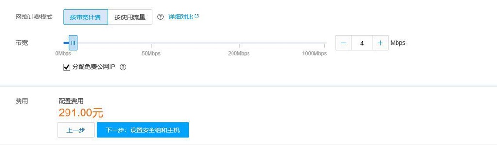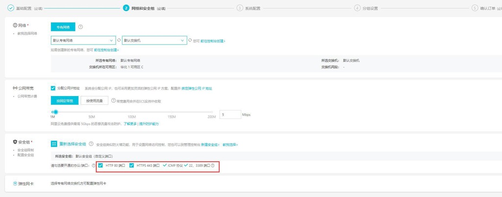 进入[网络和安全组]页面,设置网络、公网带宽、安全组。