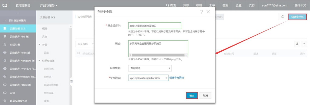 点击【创建安全组】,弹出[创建安全组]页面,填写安全组名称,选择网络类型【专有网络】,点击【确定】按钮。