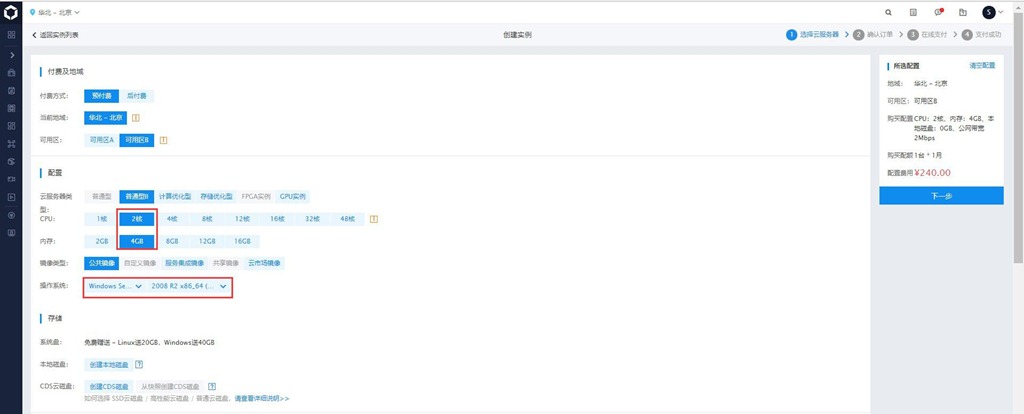 配置:选择主机配置,包括云服务器类型、CPU、内存、镜像类型、操作系统等,下图所选为奥维要求的最低配置,用户可根据实际情况选择更高的配置。