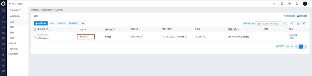 选购成功几分钟后,在控制台的【云服务器BCC/实例】中可以看到刚刚采购的云服务器已处于运行中,现在可以进行配置了。