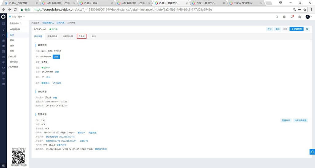 (1)登陆百度云,进入到控制台,点击【云服务器】,显示实例列表,点击购买的实例,进入[实例详情]页面。