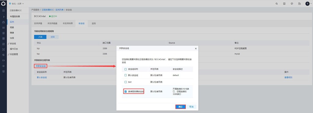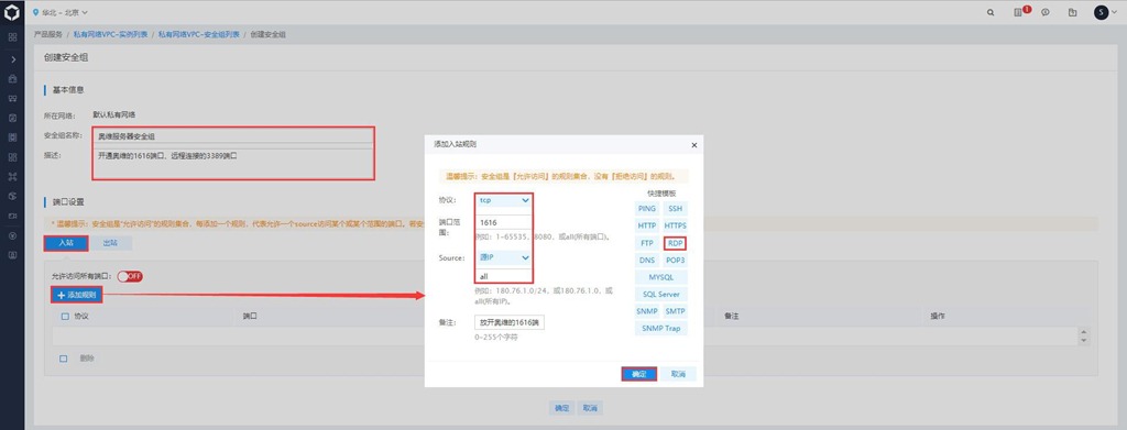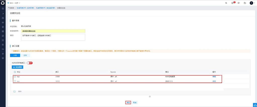 添加完1616端口后,再添加3389端口,安全组设置如下图所示,点击【确定】按钮。