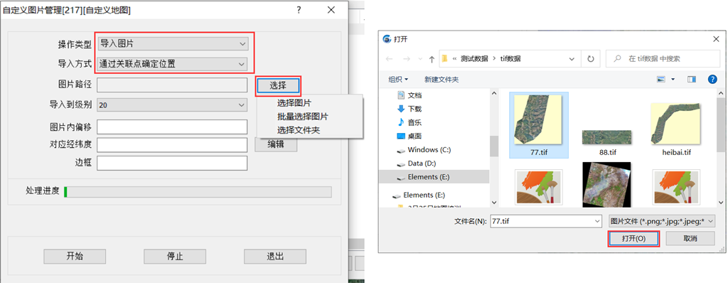 在[自定义地图管理[217]]窗口中,点击【操作类型】下拉框,选择【导入图片】,点击【导入方式】下拉框,选择【通过经纬度确定范围】,点击【图片路径】栏右侧的【选择】按钮。