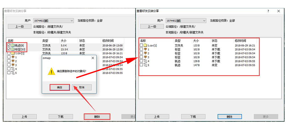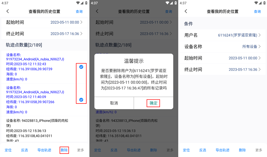 在【查看我的历史位置】窗口中,点击【删除】按钮,可删除指定条件的云端数据。删除后,则无法查询出该条件下的云端轨迹数据。