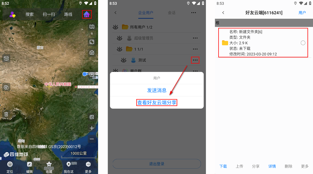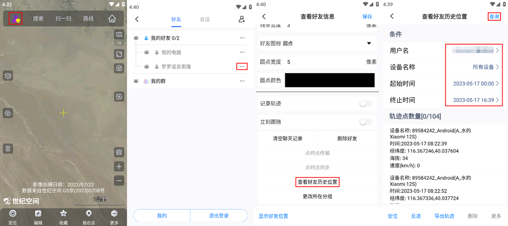 用户B登录奥维账户后,点击主界面左上角头像按钮,进入【好友】页面,点击分享了历史位置信息的用户A右侧的箭头按钮,进入【查看好友信息】页面,点击【查看好友历史位置】按钮,进入【查看好友历史位置】页面,可根据用户名、设备名称、起止时间等条件进行查询,同时也可导出轨迹。