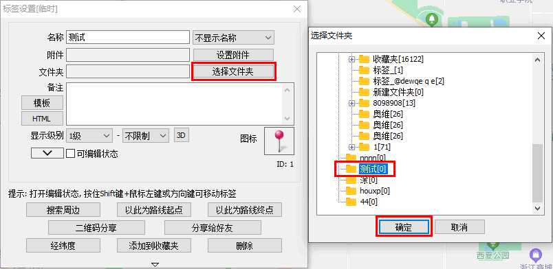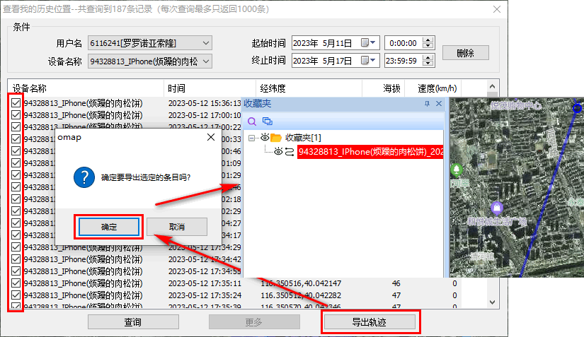 查询出历史位置后,可将其导出成轨迹。在【查看我的历史位置】窗口,勾选需要导出成轨迹的历史位置条目(不勾选将所有位置信息作为轨迹点生成轨迹,可按shift键多选),点击【导出轨迹】按钮,弹出相关提示,点击【确定】按钮,执行导出。导出完成后,在【收藏夹】和地图窗口中均会显示该轨迹。