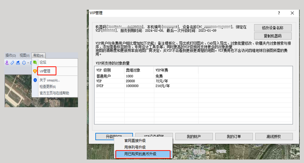 在奥维PC端上,点击[帮助]→【VIP管理】→【升级到VIP】→【用已购买的奥币升级】。
