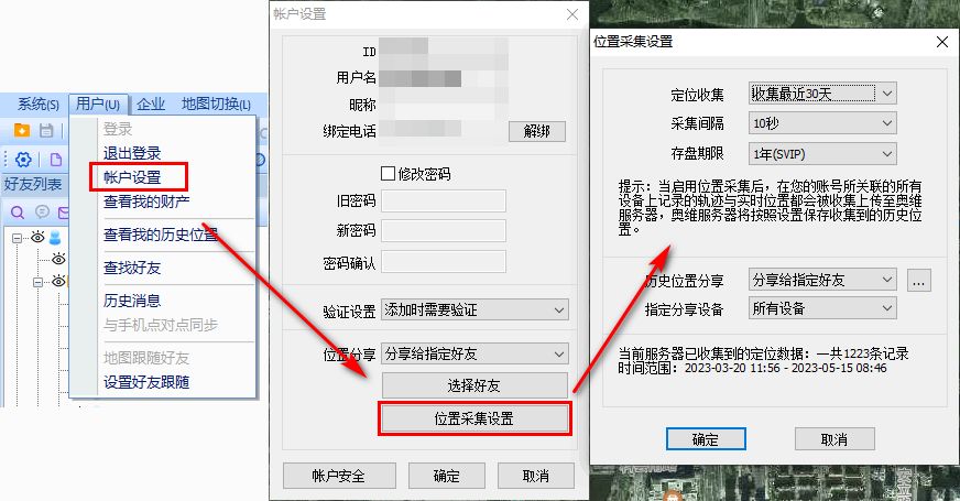 ③存盘期限:用户可根据实际需要设置,不同期限需要不同等级的VIP;若用户设置为【无】,则收集的轨迹和实时位置不会存盘。