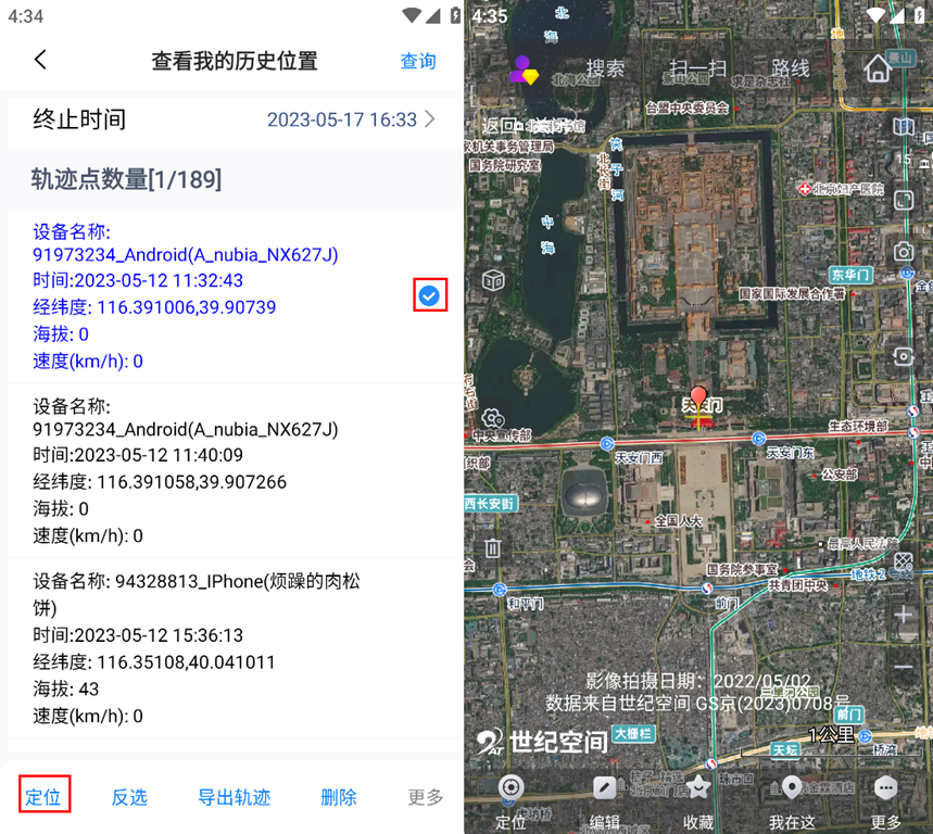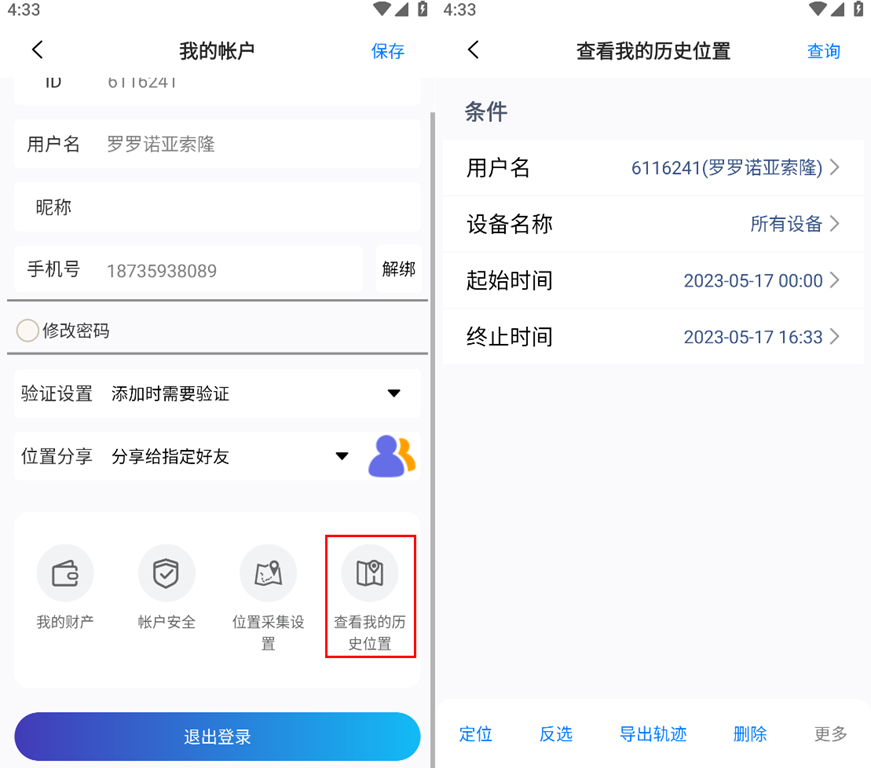 提示:导出轨迹、定位、反选等功能操作请参考本章《2、查看我的历史位置》部分。