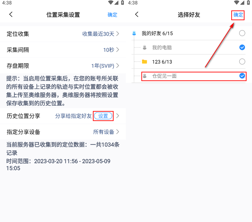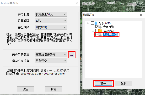 在【位置采集设置】页面中,点击【历史位置分享】下拉框,可选择【不分享历史位置】【分享给所有好友】或者【分享给指定好友】;若选择【分享给指定好友】,用户需要指定好友,假定分享给用户B。如下图,点击【设置】按钮,进入【选择好友】页面,勾选用户B,点击【确定】按钮,即可。