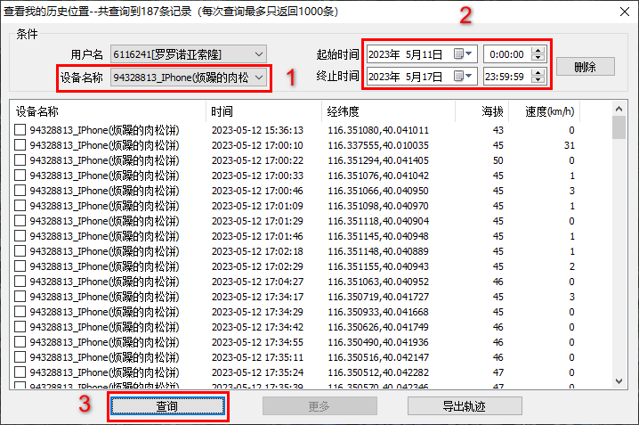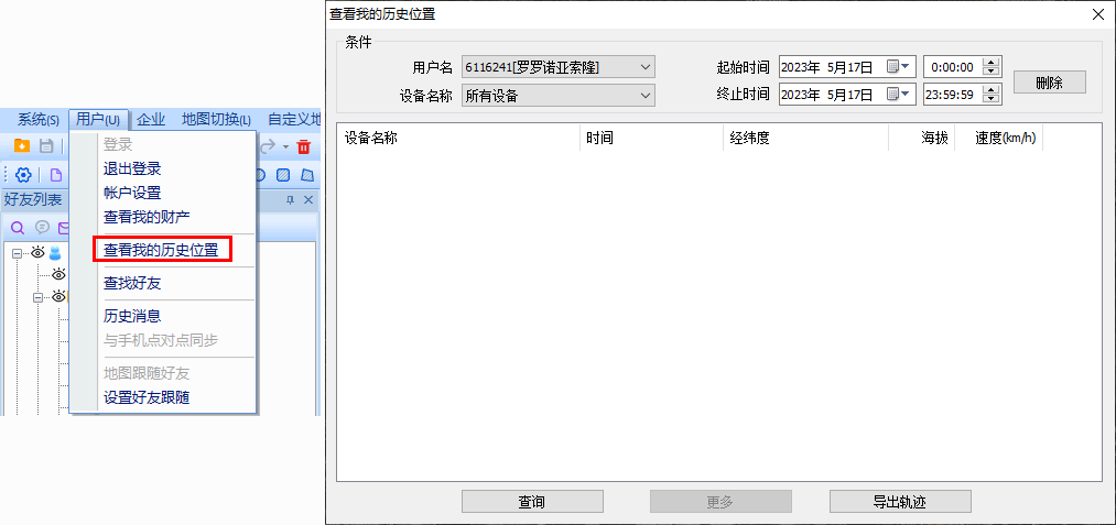在【查看我的历史位置】窗口,设置用户名、设置名称、起止时间等查询条件,点击【查询】按钮,即可查询出指定设备在某时间段内的历史位置信息。
