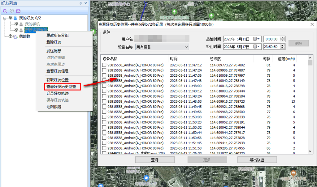 用户B登录奥维账户后,在【好友列表】窗口中,选中分享了历史位置信息的用户A,点击【右键】,点击【查看好友历史位置】,进入【查看好友历史位置】窗口,可根据用户名、设备名称、起止时间等条件进行查询,同时也可导出轨迹。
