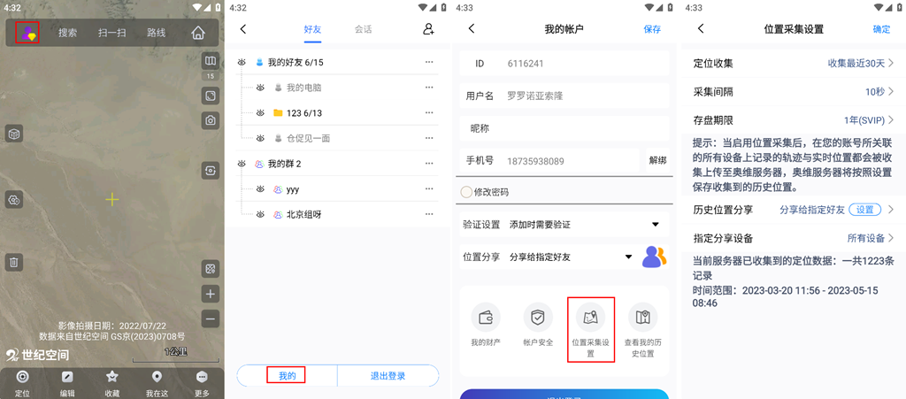 用户A登录奥维互动地图手机版客户端,点击主界面左上角头像按钮,进入【好友】页面,点击【我的】按钮,进入【我的账户】页面,点击【位置信息采集】按钮,进入【位置采集设置】页面。